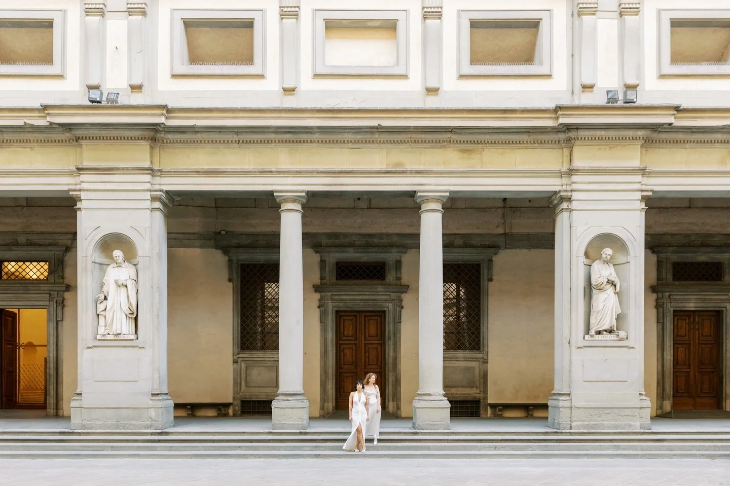 View fullsize Love in focus, art all around – a bridal couple photographed within the iconic arches of the Uffizi Gallery, Florence.